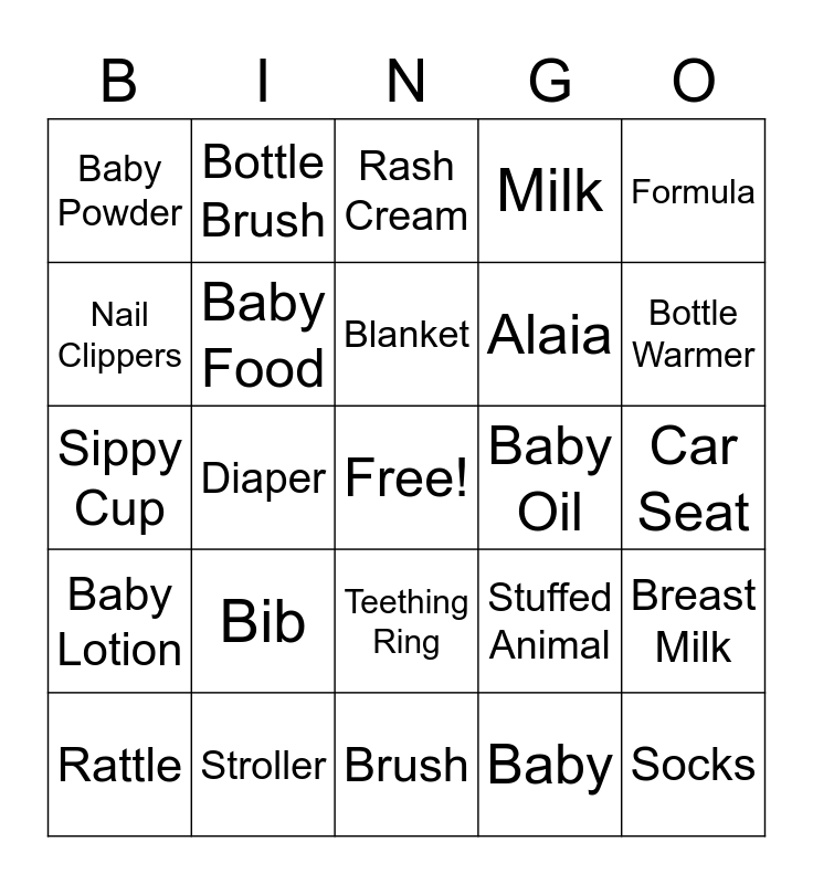 This bingo card has a free space and 32 words: Baby, Crip, Diaper, Bottle, Baby Lotion, Baby Food, Formula, Breast Milk, Bottle Brush, Swing, Blanket, Rash Cream, Wash Cloth, High Chair, Baby Oil, Pacifier, Rattle, Sippy Cup, Teething Ring, Bib, Stuffed Animal, Wipes, Car Seat, Stroller, Socks, Milk, Alaia, Nail Clippers, Baby Powder, Brush, Comb and Bottle Warmer.