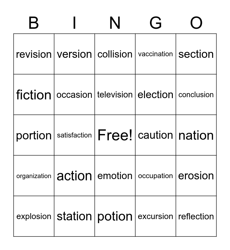 This bingo card has a free space and 24 words: action, station, television, explosion, section, revision, fiction, version, caution, emotion, election, portion, occupation, erosion, occasion, excursion, nation, collision, conclusion, satisfaction, reflection, organization, vaccination and potion.