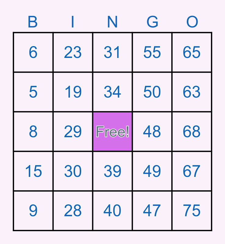 This bingo card has a free space and 75 words: 1, 16, 31, 46, 61, 2, 17, 32, 47, 62, 3, 18, 48, 63, 4, 19, 33, 49, 64, 5, 20, 34, 50, 65, 6, 21, 35, 51, 66, 7, 22, 36, 52, 67, 8, 23, 37, 53, 68, 9, 24, 38, 54, 69, 10, 25, 39, 55, 70, 11, 26, 40, 56, 71, 12, 27, 41, 57, 72, 13, 28, 42, 58, 73, 14, 29, 43, 59, 74, 15, 30, 44, 60, 75 and 45.