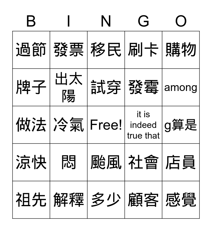 This bingo card has a free space and 29 words: 祖先, 海鮮, 冷氣, 受到..影響 g, 過節, 移民, 出太陽, 悶, it is indeed true that, 解釋, g算是, 感覺, 多少, 顧客, among, 幸虧g, 颱風, 涼快, 購物, 做法, 社會, 零下, 發霉, 牌子, 刷卡, 發票, 店員, 試穿 and 外套.