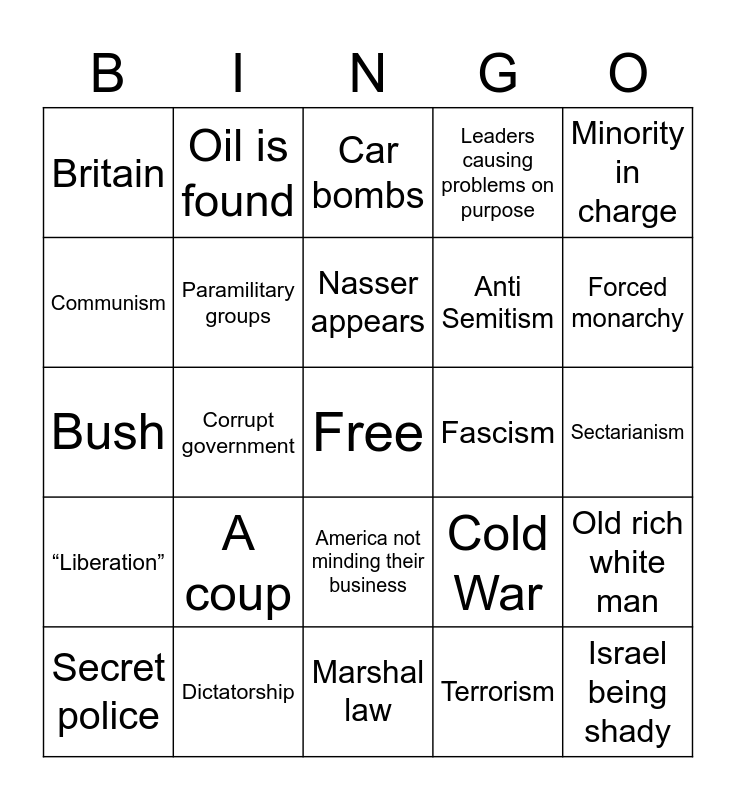 This bingo card has a free space and 24 words: A coup, Dictatorship, Nasser appears, Secret police, Minority in charge, Britain, Communism, Oil is found, Fascism, America not minding their business, Anti Semitism, Bush, Cold War, Old rich white man, Paramilitary groups, Terrorism, Sectarianism, Car bombs, Forced monarchy, Corrupt government, Israel being shady, “Liberation”, Leaders causing problems on purpose and Marshal law.
