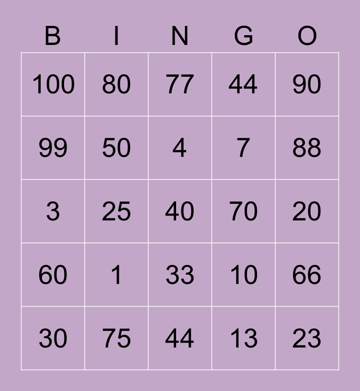 This bingo card has a free space and 24 words: 1, 75, 4, 30, 90, 100, 99, 80, 70, 33, 7, 3, 10, 66, 50, 13, 20, 77, 88, 25, 23, 60, 44 and 44.