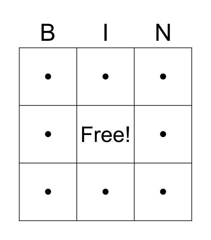This bingo card has a free space and 11 words: •, •, •, •, •, •, •, •, •, • and •.