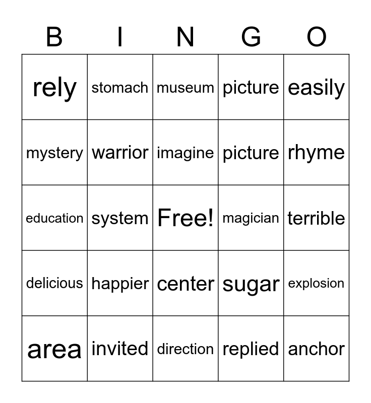 This bingo card has a free space and 24 words: happier, invited, imagine, area, easily, rely, mystery, stomach, magician, center, picture, education, sugar, explosion, warrior, replied, terrible, museum, rhyme, system, anchor, delicious, picture and direction.