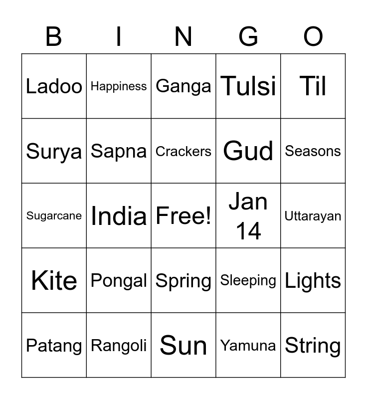 This bingo card has a free space and 29 words: Patang, Makar sankranti, India, Vitamin d, Ladoo, Ganga, Sapna, Pongal, Jan 14, Rangoli, Uttarayan, String, Sun, Yamuna, Seasons, Being sweet, Spring, Kite, Til, Sugarcane, Sleeping, Harvest, Gud, Surya, Tulsi, Happiness, Lights, Crackers and Rice.