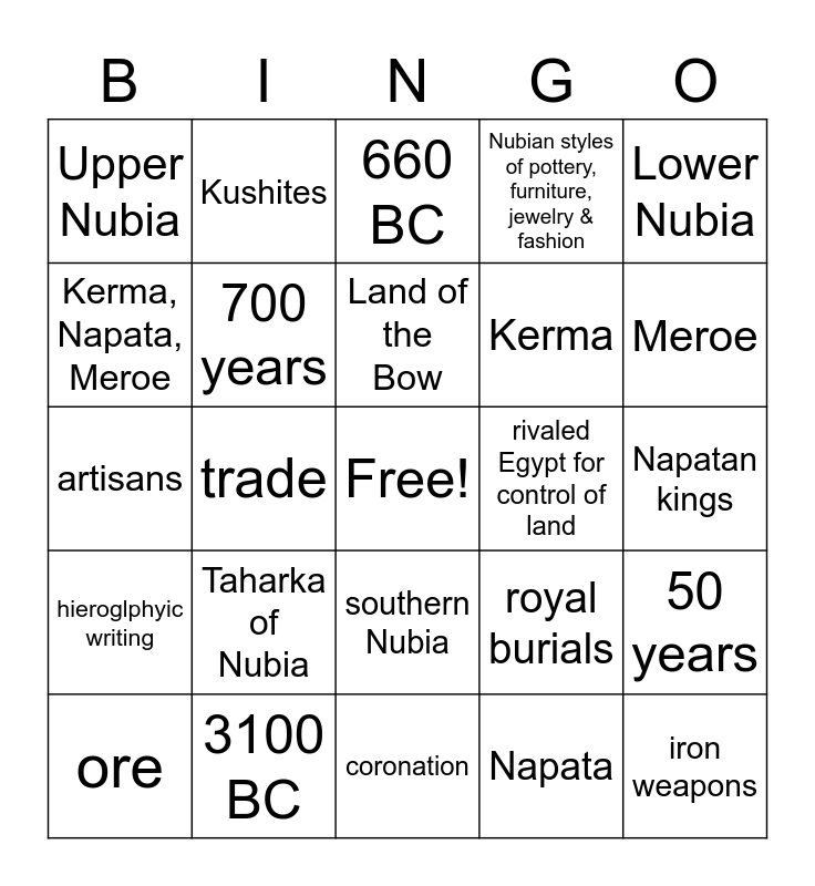 This bingo card has a free space and 24 words: Taharka of Nubia, 3100 BC, Land of the Bow, ore, Lower Nubia, Upper Nubia, Kerma, Napata, Meroe, Kushites, rivaled Egypt for control of land, southern Nubia, Kerma, artisans, royal burials, 50 years, 700 years, Napata, Napatan kings, 660 BC, Meroe, trade, iron weapons, hieroglphyic writing, Nubian styles of pottery, furniture, jewelry & fashion and coronation.