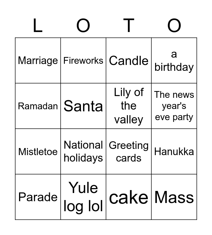 This bingo card has 20 words: Hanukka, Christmas, Candle, Presents, Parade, Ramadan, Yule log lol, Marriage, Mistletoe, Fireworks, National holidays, Greeting cards, Santa, Mass, Lily of the valley, Christmas tree, The news year's eve party, a birthday, cake and crepes.