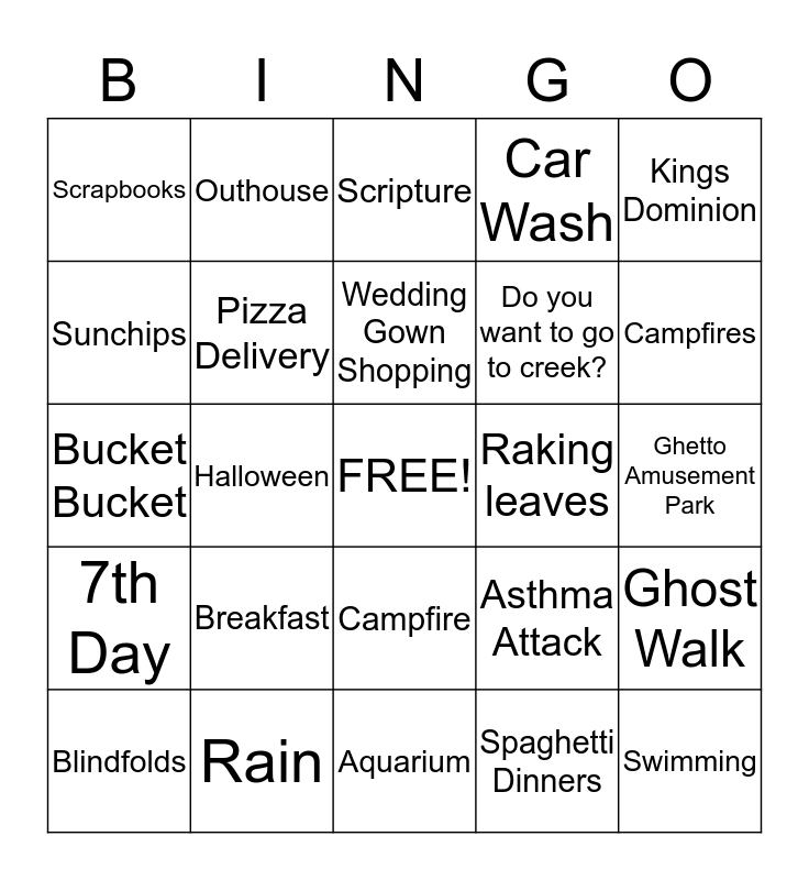 This bingo card has a free space and 24 words: Breakfast, Rain, Wedding Gown Shopping, Blindfolds, Kings Dominion, Scrapbooks, Sunchips, Outhouse, Raking leaves, Campfire, Do you want to go to creek?, Bucket Bucket, Asthma Attack, Ghost Walk, Pizza Delivery, Spaghetti Dinners, Ghetto Amusement Park, Scripture, Campfires, Halloween, Swimming, 7th Day, Car Wash and Aquarium.