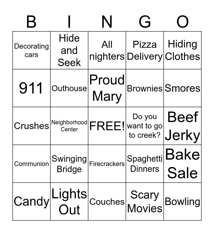 This bingo card has a free space and 24 words: Swinging Bridge, Lights Out, Proud Mary, Candy, Hiding Clothes, Decorating cars, 911, Hide and Seek, Do you want to go to creek?, Firecrackers, Brownies, Crushes, Spaghetti Dinners, Bake Sale, Outhouse, Scary Movies, Beef Jerky, All nighters, Smores, Neighborhood Center, Bowling, Communion, Pizza Delivery and Couches.