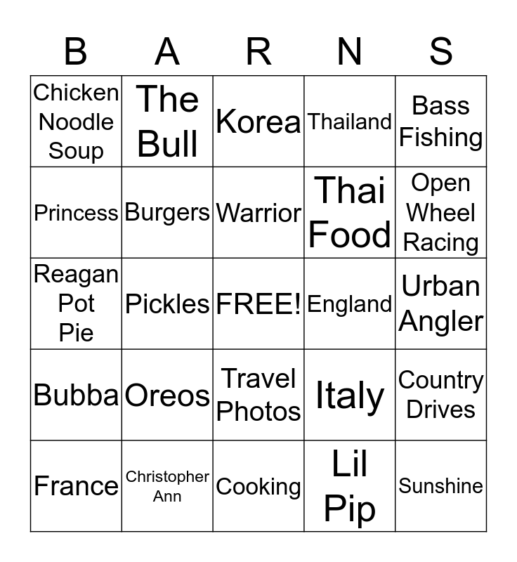 This bingo card has a free space and 24 words: Oreos, Christopher Ann, Warrior, France, Bass Fishing, Chicken Noodle Soup, Princess, The Bull, England, Travel Photos, Thai Food, Reagan Pot Pie, Italy, Country Drives, Burgers, Lil Pip, Urban Angler, Korea, Open Wheel Racing, Pickles, Sunshine, Bubba, Thailand and Cooking.