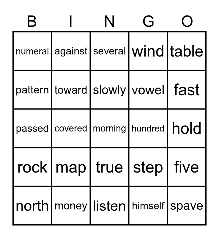 This bingo card has a free space and 24 words: map, money, slowly, north, table, numeral, pattern, against, hundred, true, vowel, passed, step, five, toward, himself, hold, several, fast, covered, spave, rock, wind and listen.