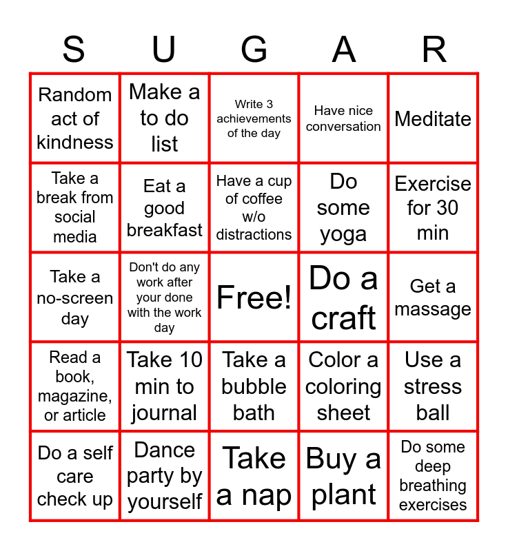 This bingo card has a free space and 24 words: Take 10 min to journal, Dance party by yourself, Have a cup of coffee w/o distractions, Do a self care check up, Meditate, Random act of kindness, Take a break from social media, Make a to do list, Do a craft, Take a bubble bath, Do some yoga, Take a no-screen day, Color a coloring sheet, Use a stress ball, Eat a good breakfast, Buy a plant, Get a massage, Write 3 achievements of the day, Exercise for 30 min, Don't do any work after your done with the work day, Do some deep breathing exercises, Read a book, magazine, or article, Have nice conversation and Take a nap.