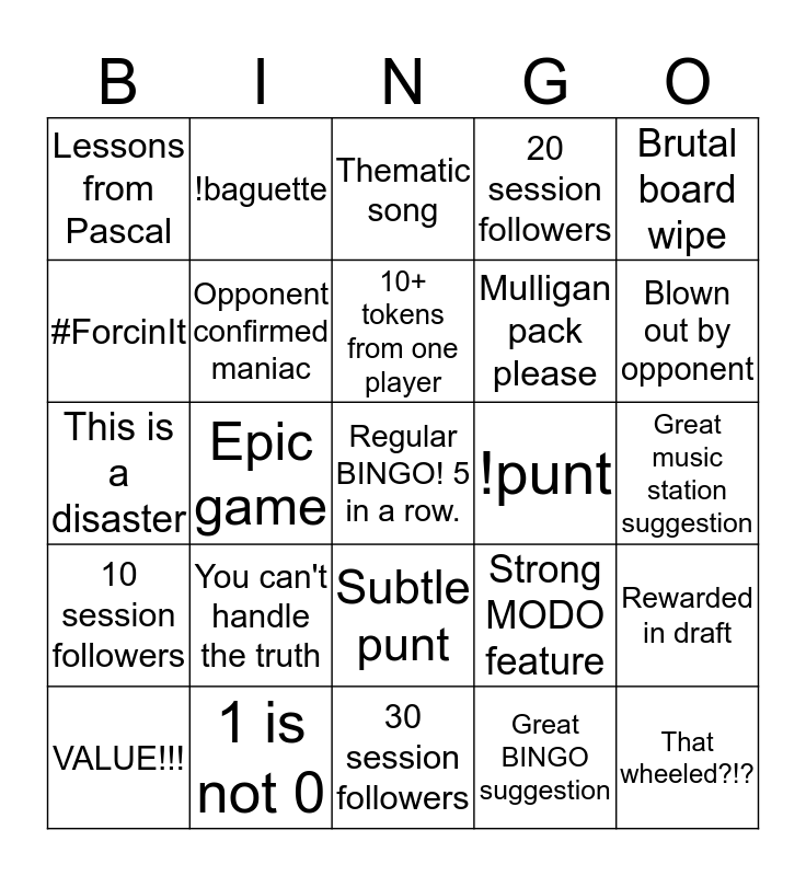 This bingo card has a free space and 24 words: You can't handle the truth, 1 is not 0, 10+ tokens from one player, VALUE!!!, Brutal board wipe, Lessons from Pascal, #ForcinIt, !baguette, !punt, Subtle punt, Mulligan pack please, This is a disaster, Strong MODO feature, Rewarded in draft, Opponent confirmed maniac, Great BINGO suggestion, Great music station suggestion, Thematic song, Blown out by opponent, Epic game, That wheeled?!?, 10 session followers, 20 session followers and 30 session followers.