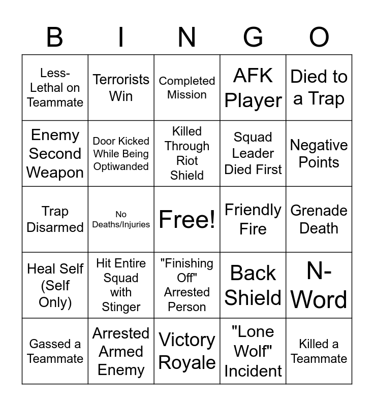 This bingo card has a free space and 43 words: Triggered a Trap, Killed a Teammate, Shot a Civillian, Gassed a Teammate, Ignored Orders, "Lone Wolf" Incident, Completed Mission, Failed Mission, Died to a Trap, Arrested Armed Enemy, AFK Player, Friendly Fire, "Finishing Off" Arrested Person, Hit Entire Squad with Stinger, Forget to Wedge, Victory Royale, Stuck in Lobby, Trap Disarmed, Grenade Through Door, Negative Points, Terrorists Win, No Squad Leader, Shield in Back, Less-Lethal on Teammate, Wallbang, Grenade Death, AI Charge, Tyler Trigger Word, Back Shield, Heal Self (Self Only), Misfire, N-Word, No Point Deductions, No Deaths/Injuries, Breaching Shotgun Used, Battering Ram Used, Optiwand Used, Killed Through Riot Shield, Enemy Second Weapon, Squad Leader Died First, Unvoluntary Death in Lobby, Door Kicked While Being Optiwanded and Denial.
