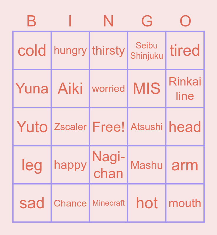 This bingo card has a free space and 24 words: sad, happy, worried, hot, tired, cold, hungry, thirsty, Atsushi, head, Yuto, Aiki, Mashu, arm, Yuna, Chance, Minecraft, Seibu Shinjuku, Rinkai line, leg, Zscaler, Nagi-chan, MIS and mouth.