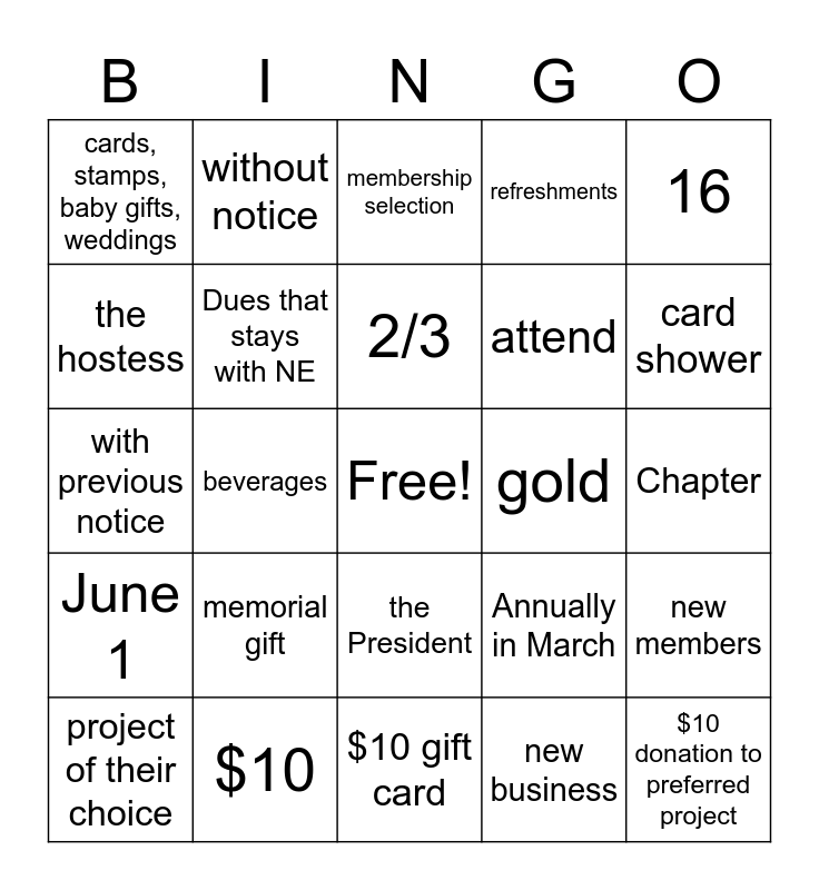 This bingo card has a free space and 36 words: 2nd Wednesday, 12, by March 1, Dues that stays with NE, Annually in March, June 1, 2/3, 6, 16, 7:30, beverages, refreshments, Chapter, gold, card shower, cards, stamps, baby gifts, weddings, acts of service, memorial gift, $10 donation to preferred project, membership selection, Chapter, new members, $10, project of their choice, $10 gift card, without notice, with previous notice, that's how we grow, attend, the hostess, treats you as though you are, not merely something you join, new business, the President, project and sales and help meetings start on time.