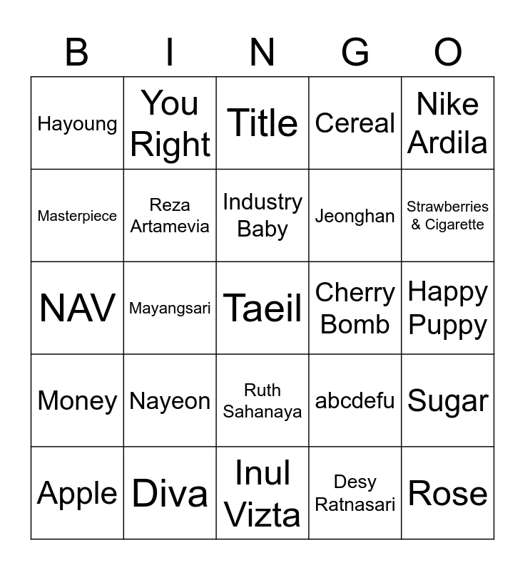 This bingo card has 25 words: Nayeon, Inul Vizta, Industry Baby, Apple, Nike Ardila, Hayoung, Masterpiece, You Right, Cherry Bomb, Ruth Sahanaya, Jeonghan, NAV, abcdefu, Sugar, Reza Artamevia, Rose, Happy Puppy, Title, Strawberries & Cigarette, Mayangsari, Taeil, Diva, Money, Cereal and Desy Ratnasari.