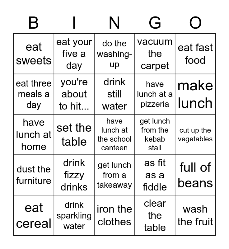 This bingo card has a free space and 24 words: drink fizzy drinks, drink sparkling water, drink still water, eat cereal, eat fast food, eat sweets, eat three meals a day, eat your five a day, get lunch from the kebab stall, get lunch from a takeaway, have lunch at a pizzeria, have lunch at home, as fit as a fiddle, full of beans, you're about to hit..., clear the table, cut up the vegetables, do the washing-up, make lunch, set the table, wash the fruit, dust the furniture, vacuum the carpet and iron the clothes.