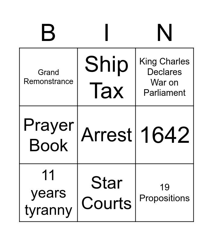 This bingo card has 9 words: 11 years tyranny, King Charles Declares War on Parliament, Ship Tax, Prayer Book, Grand Remonstrance, 1642, Arrest, 19 Propositions and Star Courts.
