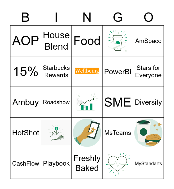 This bingo card has 7 images, a free space and 22 words: CashFlow, Partner, Roadshow, AOP, Food, Starbucks Rewards, SME, Playbook, Diversity, MyStandarts, Freshly Baked, Stars for Everyone, 20%, HotShot, AmSpace, Ambuy, MsTeams, 5%, PowerBi, 15%, House Blend and Inspire.
