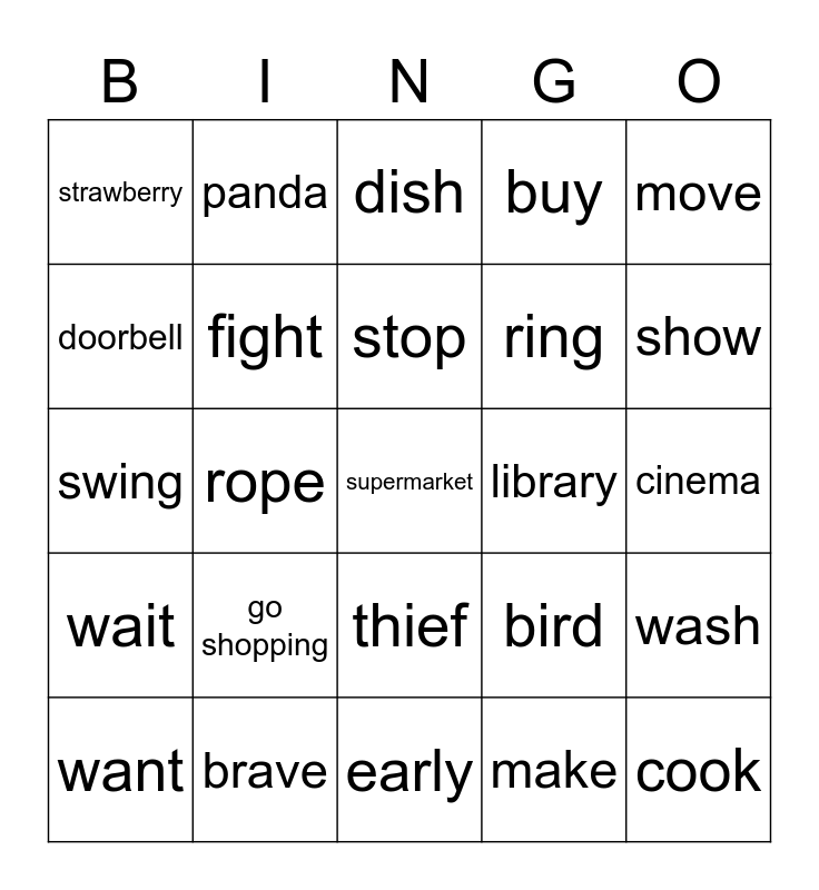 This bingo card has 40 words: Free!, swing, go for a walk, fight, brave, thief, stop, chase, move, wait, rope, buy, supermarket, cinema, library, go shopping, taste, strawberry, floor, dish, wash, make, ring, doorbell, home, bored, talk, learn, cook, autumn, spring, want, late, bird, show, early, wake up, leaf, panda and excited.