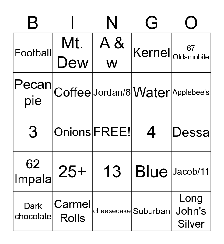 This bingo card has a free space and 24 words: 25+, Carmel Rolls, Jordan/8, Dark chocolate, 67 Oldsmobile, Football, Pecan pie, Mt. Dew, 4, 13, Water, 3, Blue, Jacob/11, Coffee, Suburban, Dessa, A & w, Applebee's, Onions, Long John's Silver, 62 Impala, Kernel and cheesecake.