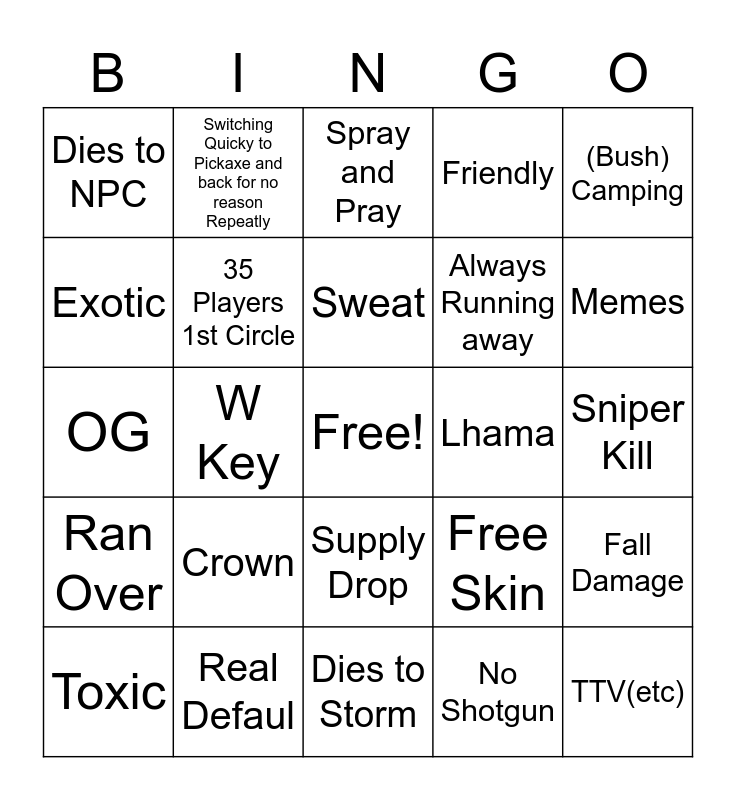 This bingo card has a free space and 24 words: Crown, Real Defaul, Sweat, Toxic, (Bush) Camping, Dies to NPC, Exotic, Switching Quicky to Pickaxe and back for no reason Repeatly, Lhama, Supply Drop, Always Running away, OG, Free Skin, Fall Damage, 35 Players 1st Circle, No Shotgun, Sniper Kill, Spray and Pray, Memes, W Key, TTV(etc), Ran Over, Friendly and Dies to Storm.