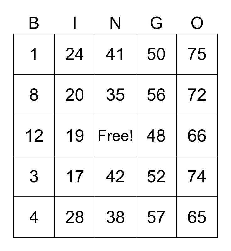 This bingo card has a free space and 24 words: 4, 17, 35, 57, 75, 1, 24, 41, 48, 66, 12, 20, 52, 74, 8, 28, 38, 50, 72, 3, 19, 42, 56 and 65.
