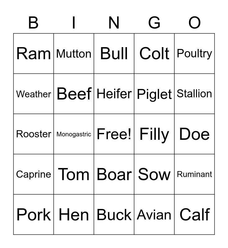 This bingo card has a free space and 34 words: Bovine, Avian, Ovine, Equine, Caprine, Beef, Poultry, Pork, Mutton, Cow, Heifer, Bull, Steer, Mare, Filly, Stallion, Hen, Rooster, Tom, Sow, Boar, Ewe, Ram, Doe, Buck, Calf, Colt, Foal, Piglet, Weather, Lamb, Monogastric, Ruminant and Kid.