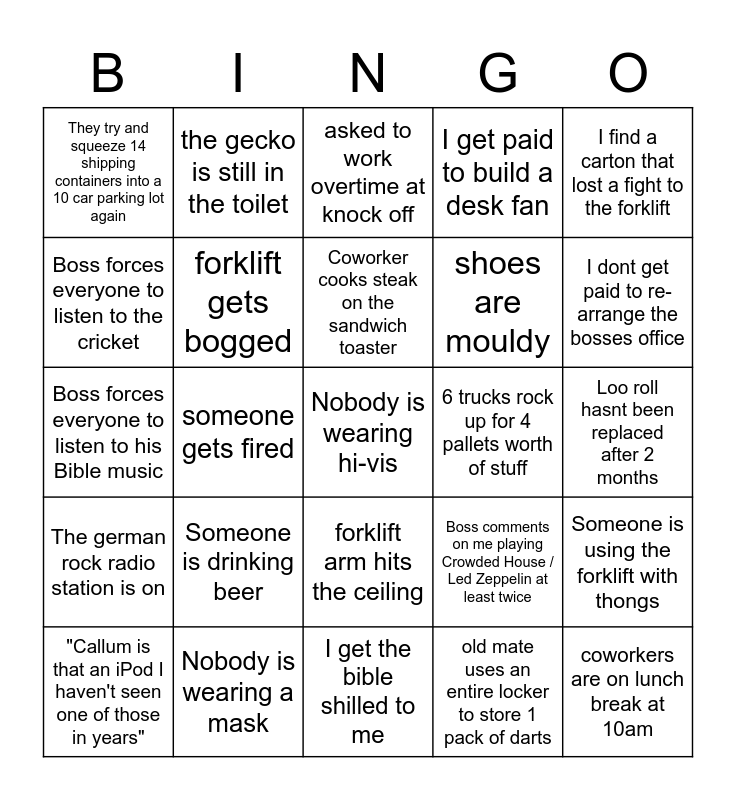 This bingo card has a free space and 24 words: Someone is drinking beer, Nobody is wearing a mask, Coworker cooks steak on the sandwich toaster, "Callum is that an iPod I haven't seen one of those in years", I find a carton that lost a fight to the forklift, They try and squeeze 14 shipping containers into a 10 car parking lot again, Boss forces everyone to listen to the cricket, the gecko is still in the toilet, 6 trucks rock up for 4 pallets worth of stuff, forklift arm hits the ceiling, shoes are mouldy, Boss forces everyone to listen to his Bible music, Boss comments on me playing Crowded House / Led Zeppelin at least twice, Someone is using the forklift with thongs, forklift gets bogged, old mate uses an entire locker to store 1 pack of darts, Loo roll hasnt been replaced after 2 months, asked to work overtime at knock off, I dont get paid to re-arrange the bosses office, someone gets fired, coworkers are on lunch break at 10am, The german rock radio station is on, I get paid to build a desk fan and I get the bible shilled to me.