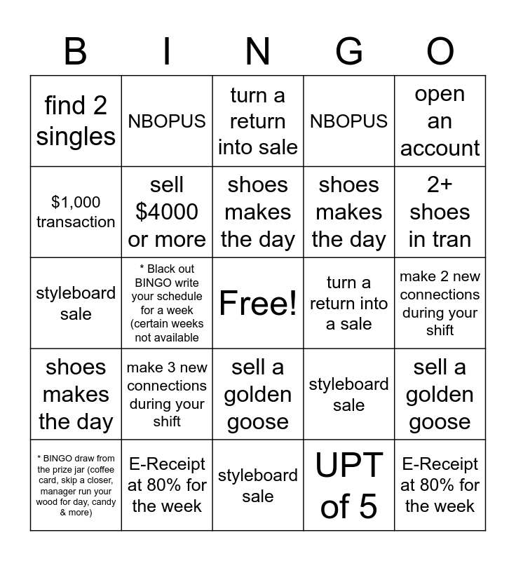 This bingo card has a free space and 27 words: NBOPUS, E-Receipt at 80% for the week, shoes makes the day, UPT of 5, open an account, $1,000 transaction, NBOPUS, styleboard sale, turn a return into a sale, sell a golden goose, shoes makes the day, sell $4000 or more, styleboard sale, E-Receipt at 80% for the week, styleboard sale, open an account, turn a return into sale, NBOPUS, make 2 new connections during your shift, find 2 singles, make 3 new connections during your shift, sell a golden goose, shoes makes the day, 2+ shoes in tran, * BINGO draw from the prize jar (coffee card, skip a closer, manager run your wood for day, candy & more), * Black out BINGO write your schedule for a week (certain weeks not available and * Black out BINGO Bazille Card.