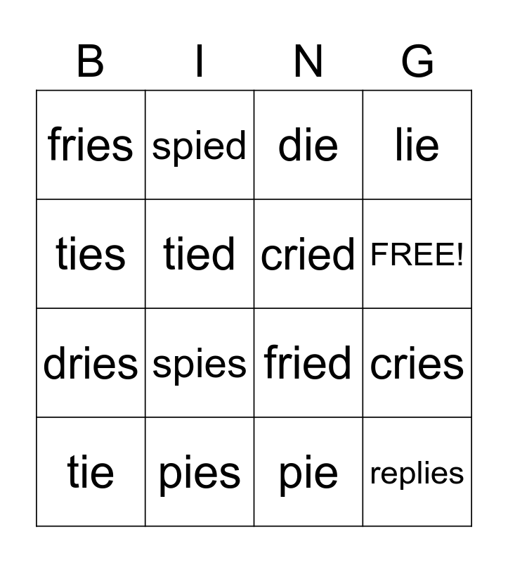 This bingo card has 17 words: pie, tie, die, fries, spies, lie, cries, cried, FREE!, tied, pies, fried, ties, spied, dries, dried and replies.