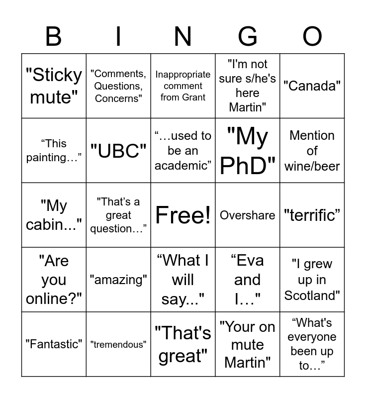 This bingo card has a free space and 26 words: “What I will say...", "Your on mute Martin", “…used to be an academic”, "tremendous", "Canada", "Sticky mute", “This painting…”, "Comments, Questions, Concerns", "terrific”, “Eva and I…", "My PhD", "My cabin...", "I grew up in Scotland", "Fantastic", "That’s a great question…”, “What I will do...", "I'm not sure s/he's here Martin", "Are you online?", Inappropriate comment from Grant, “What's everyone been up to…”, Mention of wine/beer, "That's great", Overshare, "amazing", "UBC" and Survey.
