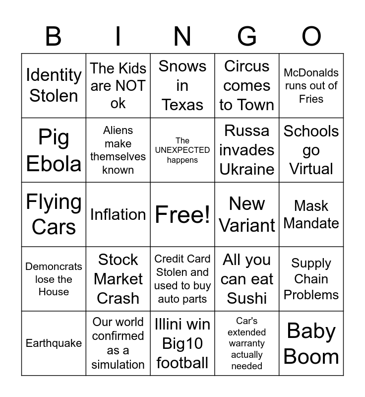 This bingo card has a free space and 24 words: Stock Market Crash, Our world confirmed as a simulation, The UNEXPECTED happens, Earthquake, McDonalds runs out of Fries, Identity Stolen, Pig Ebola, The Kids are NOT ok, New Variant, Credit Card Stolen and used to buy auto parts, Russa invades Ukraine, Flying Cars, All you can eat Sushi, Supply Chain Problems, Aliens make themselves known, Car's extended warranty actually needed, Mask Mandate, Snows in Texas, Schools go Virtual, Inflation, Baby Boom, Demoncrats lose the House, Circus comes to Town and Illini win Big10 football.