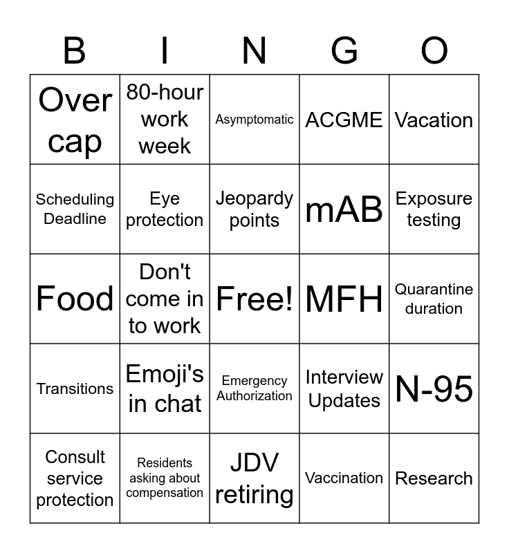 This bingo card has a free space and 24 words: Emoji's in chat, Residents asking about compensation, Jeopardy points, Consult service protection, Vacation, Over cap, Scheduling Deadline, 80-hour work week, MFH, Emergency Authorization, mAB, Food, Interview Updates, N-95, Eye protection, Vaccination, Quarantine duration, Asymptomatic, Exposure testing, Don't come in to work, Research, Transitions, ACGME and JDV retiring.