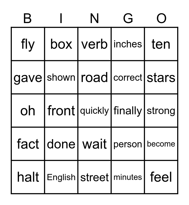 This bingo card has a free space and 24 words: done, English, road, halt, ten, fly, gave, box, finally, wait, correct, oh, person, become, shown, minutes, strong, verb, stars, front, feel, fact, inches and street.