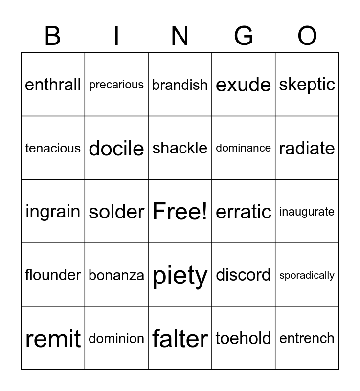 This bingo card has a free space and 24 words: bonanza, dominion, shackle, remit, skeptic, enthrall, tenacious, precarious, erratic, piety, dominance, ingrain, discord, sporadically, docile, toehold, inaugurate, brandish, radiate, solder, entrench, flounder, exude and falter.