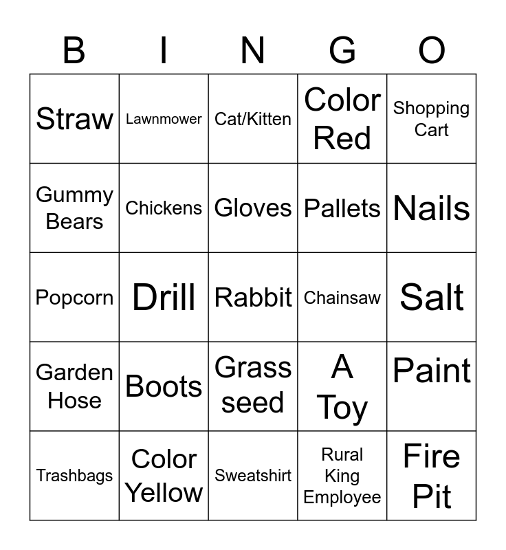 This bingo card has a free space and 24 words: Boots, Color Yellow, Gloves, Trashbags, Shopping Cart, Straw, Gummy Bears, Lawnmower, Chainsaw, Grass seed, Pallets, Popcorn, A Toy, Paint, Chickens, Rural King Employee, Salt, Cat/Kitten, Nails, Drill, Fire Pit, Garden Hose, Color Red and Sweatshirt.