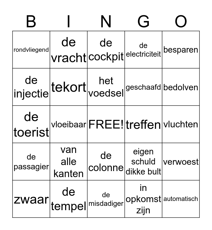 This bingo card has a free space and 27 words: eigen schuld dikke bult, uitsloven, geschaafd, de misdadiger, de injectie, de cockpit, de vracht, de passagier, treffen, verwoest, de toerist, de electriciteit, zwaar, de tempel, bedolven, het puin, tekort, het voedsel, van alle kanten, rondvliegend, vluchten, in opkomst zijn, vloeibaar, automatisch, de colonne, besparen and het voordeel.