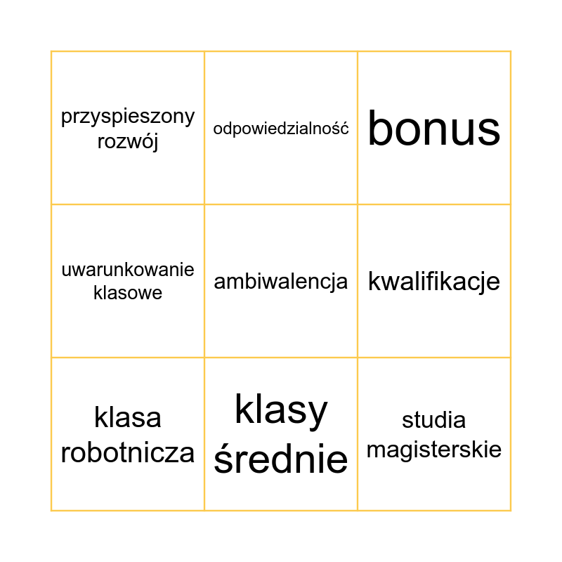 This bingo card has a free space and 8 words: kwalifikacje, bonus, odpowiedzialność, klasa robotnicza, przyspieszony rozwój, studia magisterskie, uwarunkowanie klasowe and klasy średnie.