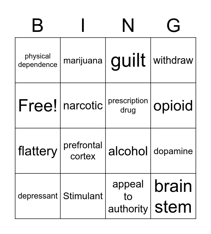 This bingo card has 16 words: Stimulant, dopamine, guilt, physical dependence, flattery, marijuana, alcohol, appeal to authority, Free!, narcotic, depressant, withdraw, prefrontal cortex, opioid, prescription drug and brain stem.