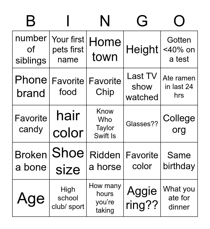 This bingo card has a free space and 29 words: Age, Major, hair color, eye color, number of siblings, Home town, Favorite food, Shoe size, Glasses??, High school club/ sport, College org, What you ate for dinner, How many hours you’re taking, Aggie ring??, Ate ramen in last 24 hrs, Owns pet other than dog/cat, Ridden a horse, Broken a bone, Gotten <40% on a test, Favorite candy, Favorite color, Turtles >>>>> any other animal, Last TV show watched, Phone brand, Height, Your first pets first name, Same birthday, Favorite Chip and Have you ever worn braces ever in your life.