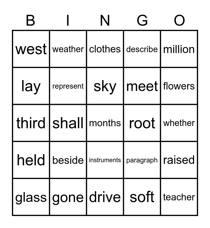 This bingo card has a free space and 24 words: beside, gone, sky, glass, million, west, lay, weather, root, instruments, meet, third, paragraph, raised, represent, soft, whether, clothes, flowers, shall, teacher, held, describe and drive.