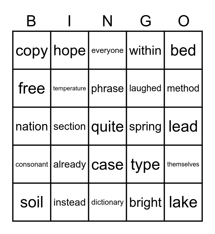 This bingo card has a free space and 24 words: already, instead, phrase, soil, bed, copy, free, hope, spring, case, laughed, nation, type, themselves, temperature, bright, lead, everyone, method, section, lake, consonant, within and dictionary.