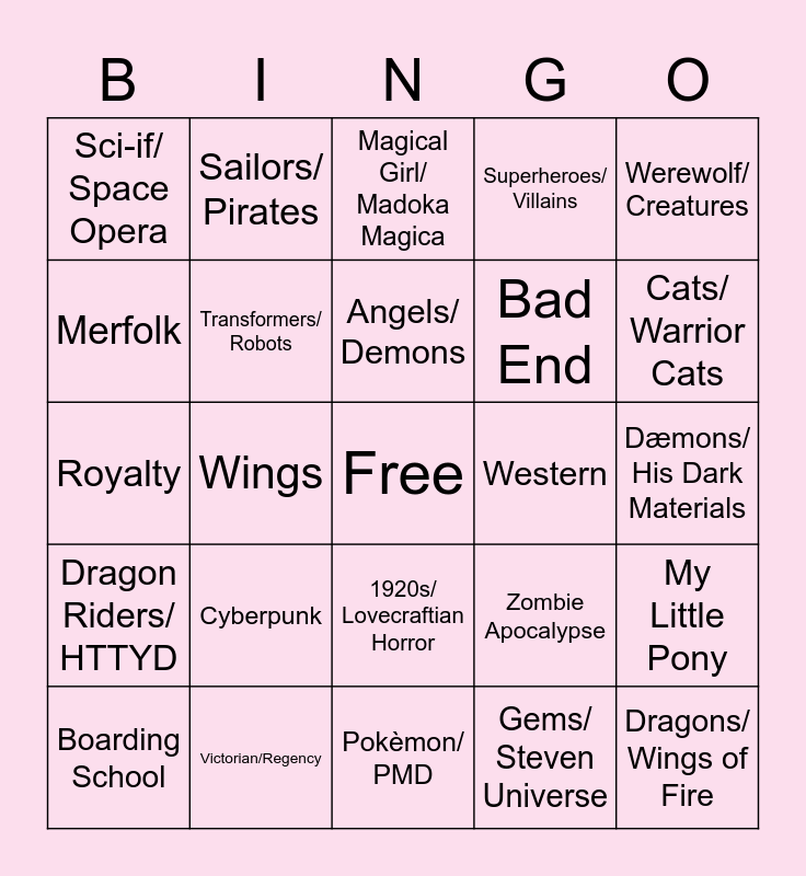 This bingo card has a free space and 24 words: Cyberpunk, Victorian/Regency, Angels/ Demons, Boarding School, Werewolf/ Creatures, Sci-if/ Space Opera, Merfolk, Sailors/ Pirates, Western, 1920s/ Lovecraftian Horror, Bad End, Royalty, Zombie Apocalypse, My Little Pony, Transformers/ Robots, Gems/ Steven Universe, Dæmons/ His Dark Materials, Magical Girl/ Madoka Magica, Cats/ Warrior Cats, Wings, Dragons/ Wings of Fire, Dragon Riders/ HTTYD, Superheroes/ Villains and Pokèmon/ PMD.