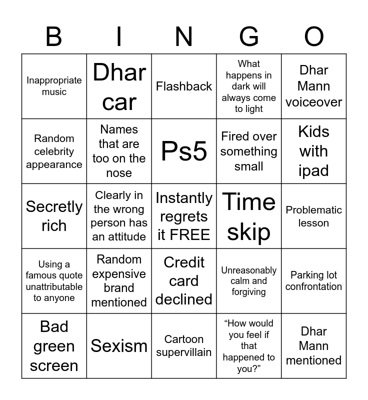 This bingo card has a free space and 32 words: “How would you feel if that happened to you?”, Child with unrealistic emotional maturity, Clearly in the wrong person has an attitude, Random dramatic and emotional monologue, Using a famous quote unattributable to anyone, Names that are too on the nose, Dhar Mann voiceover, Parking lot confrontation, Dhar car, “You see” / “so you see”, Ps5, Flashback, Husband is fired, Merch in video, Time skip, Bad props, Bad green screen, Secretly rich, Credit card declined, Random expensive brand mentioned, Unreasonably calm and forgiving, Extreme coincidence, Problematic lesson, Sexism, Dhar Mann mentioned, What happens in dark will always come to light, Fired over something small, Random celebrity appearance, Inappropriate music, Cartoon supervillain, Someone gets evicted and Kids with ipad.