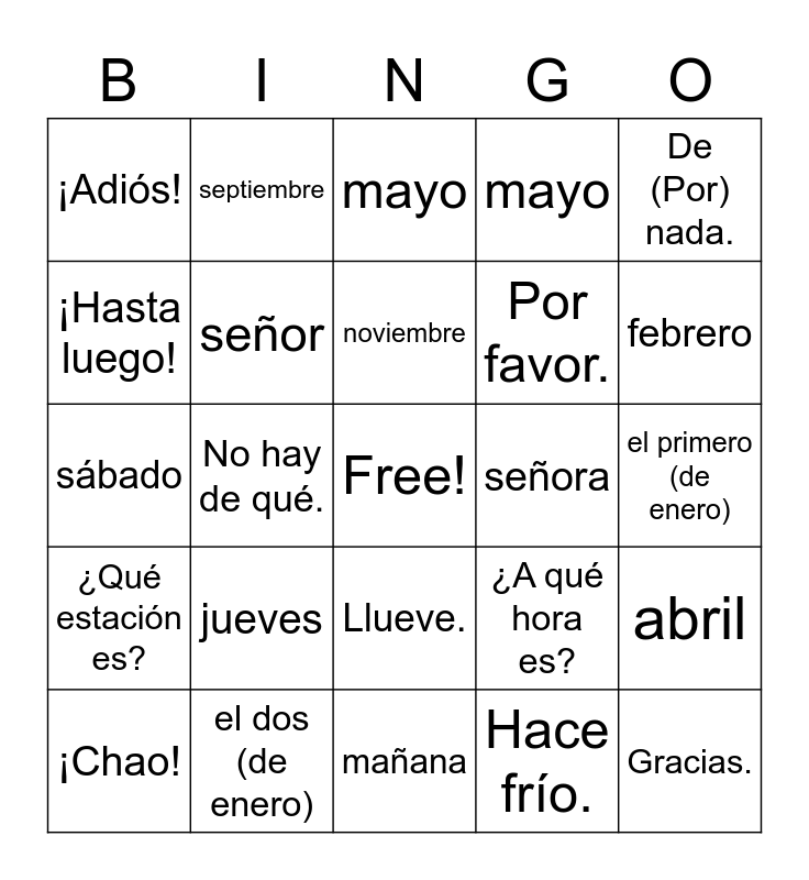 This bingo card has a free space and 82 words: marzo, abril, mayo, junio, saludos, ¡Hola!, Buenos días., Buenas tardes., Buenas noches., ¿Qué tal?, Bien, gracias., Muy bien., señor, señora, señorita, ¡Adiós!, ¡Chao!, ¡Hasta luego!, ¡Hasta pronto!, ¡Hasta mañana!, la cortesía, Por favor., Gracias., De (Por) nada., No hay de qué., ¿Qué día es hoy?, la semana, lunes, martes, miércoles, jueves, viernes, sábado, domingo, hoy, mañana, ¿Cuál es la fecha de hoy?, enero, febrero, marzo, abril, mayo, junio, julio, agosto, septiembre, octubre, noviembre, diciembre, el mes, el año, el primero (de enero), el dos (de enero), ¿Qué hora es?, Es la una., Son las dos, (tres, cuatro…)., y cuarto, y media, ¿A qué hora es?, Es a la una (a las dos,, a las tres…)., ¿Qué estación es?, el invierno, la primavera, el verano, el otoño, ¿Qué tiempo hace?, Hace buen tiempo., Hace (mucho) calor., Hace (Hay) sol., Hace mal tiempo., Llueve., Hace frío., Nieva., Hace fresco., Hace viento., ¿Cuánto es?, el cumpleaños, marzo, abril and mayo.