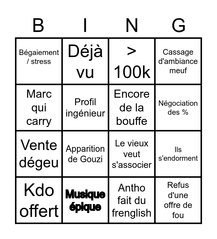 This bingo card has 16 words: Musique épique, Ils s'endorment, > 100k, Bégaiement / stress, Vente dégeu, Déjà vu, Le vieux veut s'associer, Antho fait du frenglish, Marc qui carry, Profil ingénieur, Kdo offert, Cassage d'ambiance meuf, Apparition de Gouzi, Négociation des %, Encore de la bouffe and Refus d'une offre de fou.