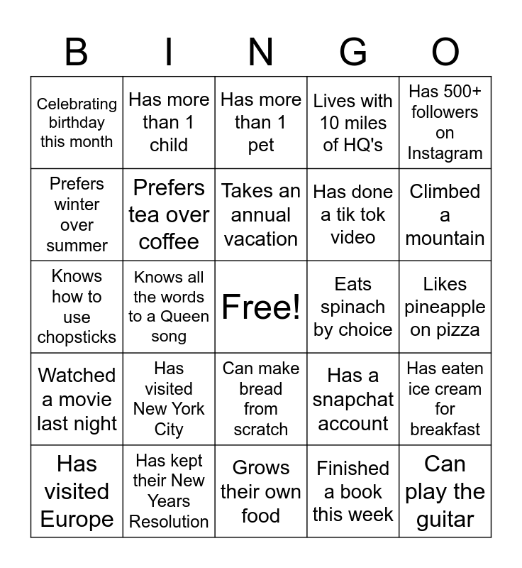 This bingo card has a free space and 29 words: Has visited Europe, Has a YouTube channel, Knows all the words to a Queen song, Has worked here for 10+ years, Celebrating birthday this month, Has more than 1 pet, Prefers tea over coffee, Has visited New York City, Eats spinach by choice, Has kept their New Years Resolution, Likes pineapple on pizza, Can play the guitar, Grows their own food, Finished a book this week, Climbed a mountain, Has taken swimming lessons, Can make bread from scratch, Watched a movie last night, Has 500+ followers on Instagram, Knows how to use chopsticks, Has a snapchat account, Goes to bed before 10 pm, Has done a tik tok video, Prefers winter over summer, Lives with 10 miles of HQ's, Has more than 1 child, Has eaten ice cream for breakfast, Takes an annual vacation and Loves amusements parks.