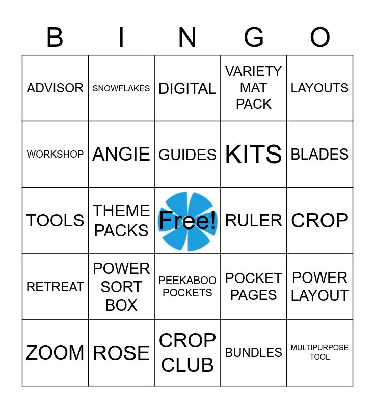 This bingo card has a free space and 38 words: DORIS, JOY, ALANA, ANGIE, POWER LAYOUT, POWER SORT BOX, GUIDES, SKETCHES, LAYOUTS, KITS, THEME PACKS, VARIETY MAT PACK, MULTIPURPOSE TOOL, CROP, WORKSHOP, RETREAT, FOAM SQUARES, DIGITAL, CORNER ROUNDER, RULER, ADVISOR, ROSE, BLADES, ZOOM, SCRAPBOOKING, CROP CLUB, ABC’S, SECRET BOXES, PROJECT RECIPES, PHOTOS, MEMORABILIA, PEEKABOO POCKETS, BUNDLES, SNOWFLAKES, IDEAS, POCKET PAGES, TOOLS and ORGANIZATION.